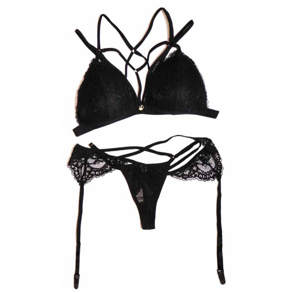 CONJUNTO VICTORIA es un bralette de copa triangular en encaje demasiado precioso para ocultarlo, con broche trasero y banda elástica para sentirte fresca y relajada. Está diseñado para no pasar inadvertido y resaltar con prendas exteriores, tiene un pantie liguero tipo tanga brasilera en encaje floral y tul. . Llévalo de día o de noche debajo de tus blusas semitransparentes y logra un look muy sexy.